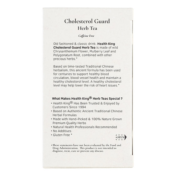 Cholesterol Guard Herb Tea, by Health King supports healthy blood circulation, helps maintains the health of and circulatory system, and help maintain healthy cholesterol levels. Amount: 20 tea bags.