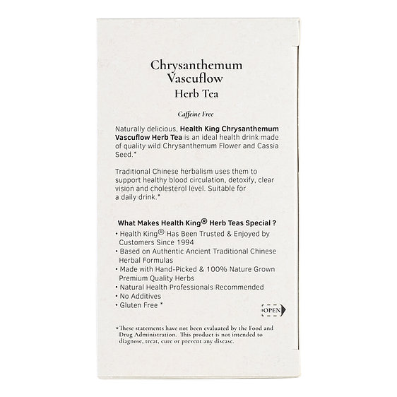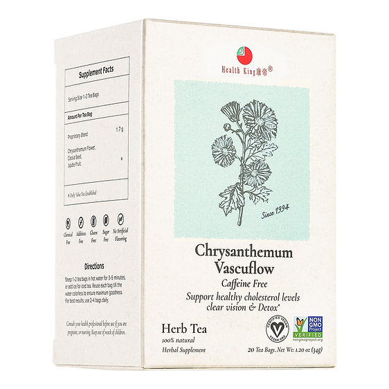 Chrysanthemum Vascuflow Herb Tea, by Health King supports healthy blood circulation & cholesterol levels; also nourishes the eyes & promotes clear vision. Amount: 20 tea bags.
