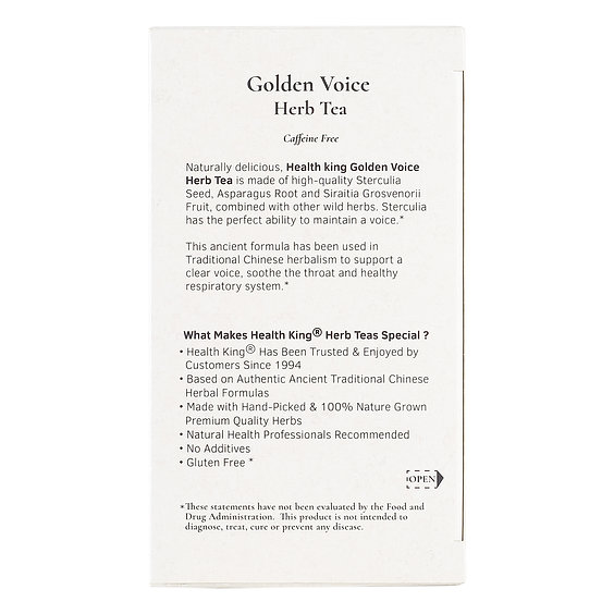 Golden Voice Herb Tea, by Health King provides temporary relief for sore throat and hoarseness of voice. Amount: 20 tea bags.