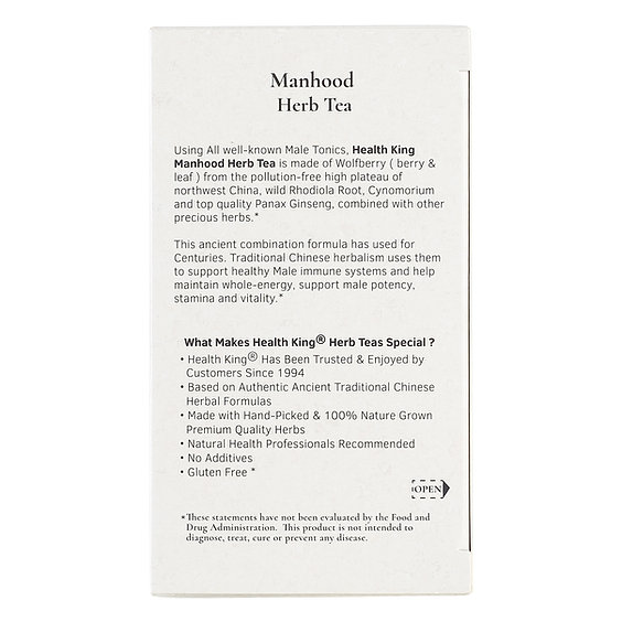 Manhood Herb Tea, by Health King supports male potency, virility, and vitality; also helps bolster the immune system. Amount: 20 tea bags.